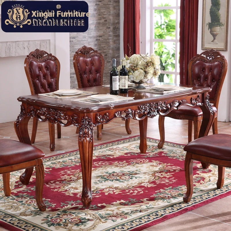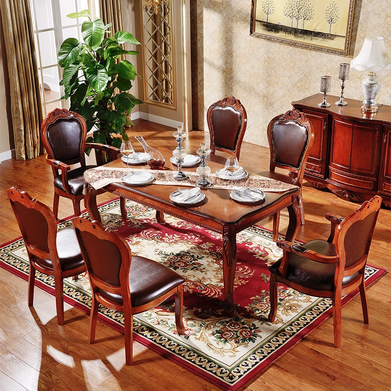 Elegant European Style Marble Top Dining Table - Solid Wood American Vintage Dining Set with 1 Table and 6 Chairs for a Luxurious Dining Experience