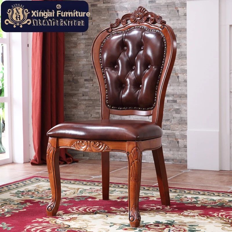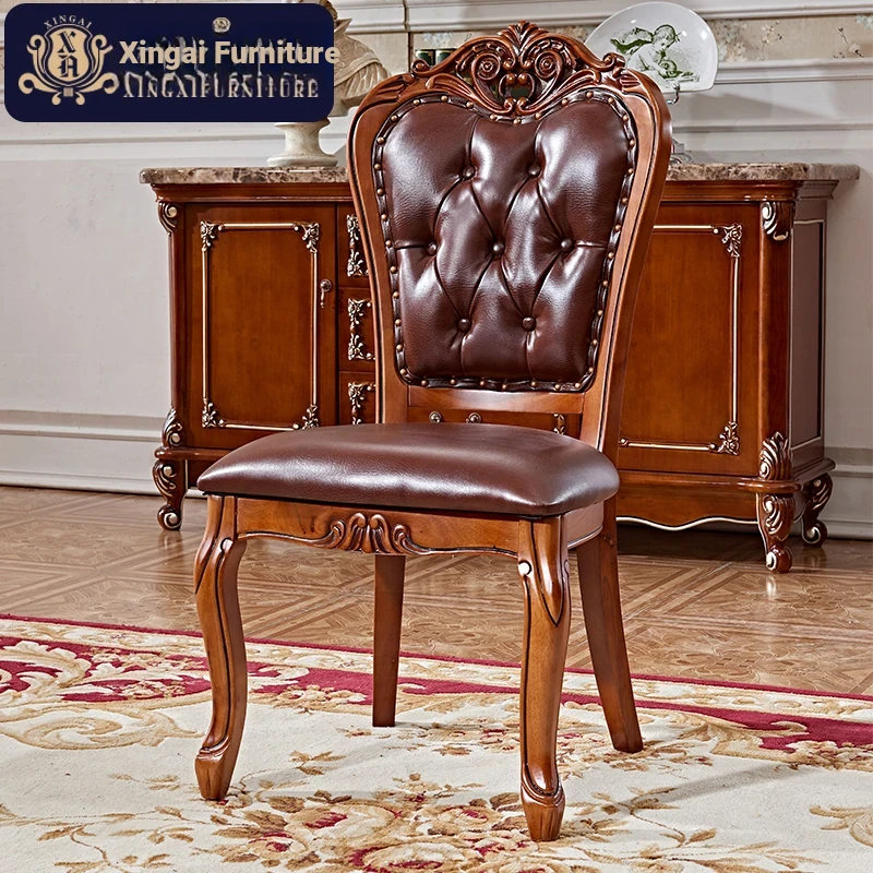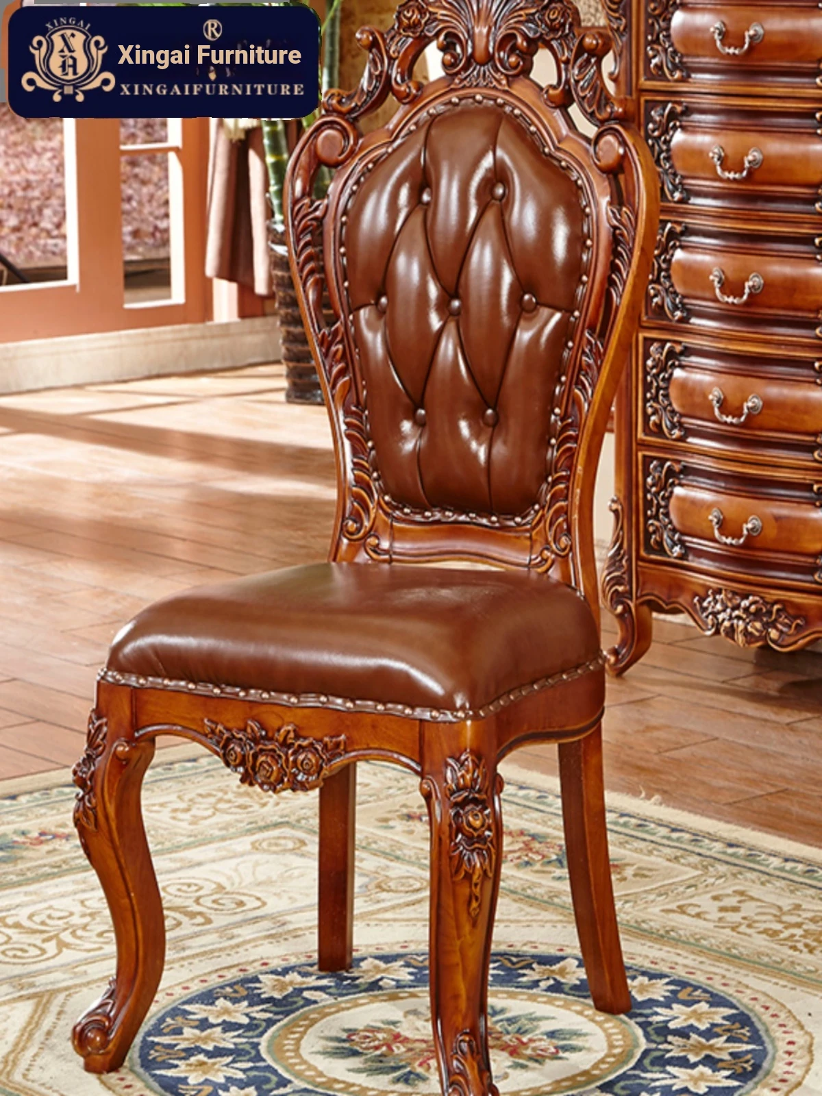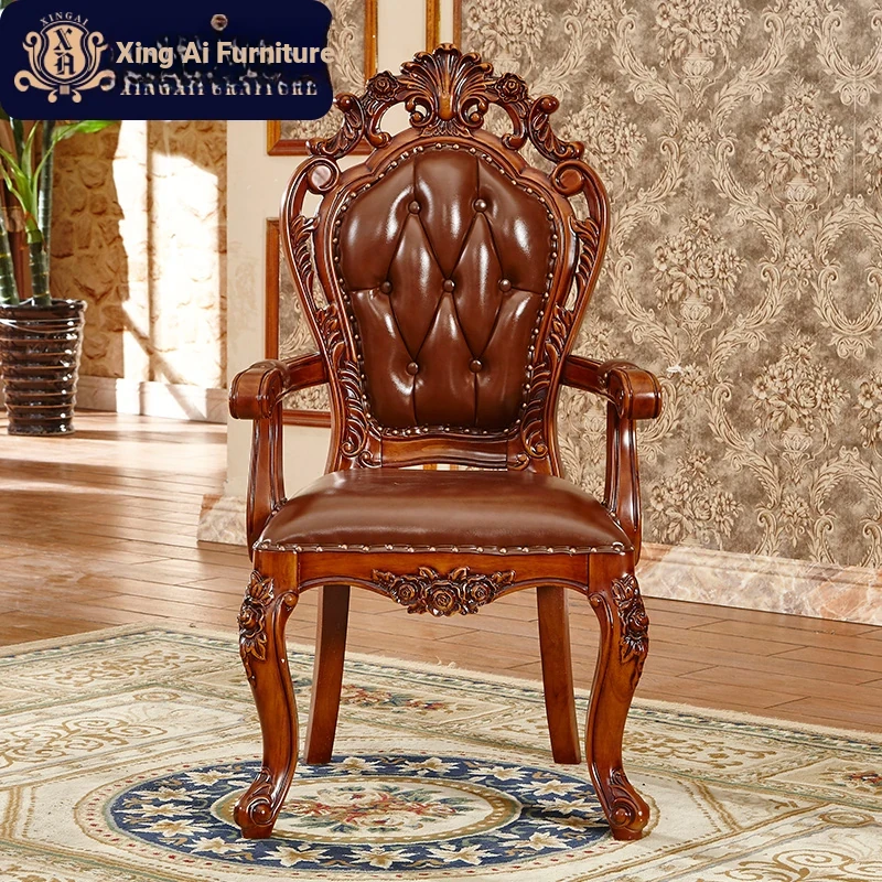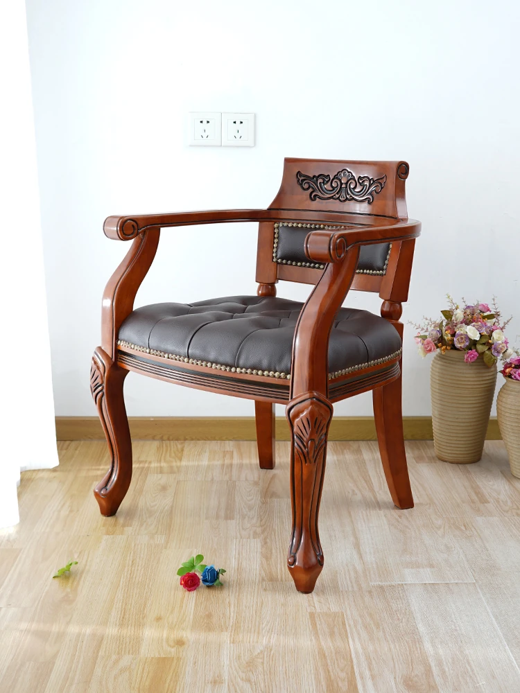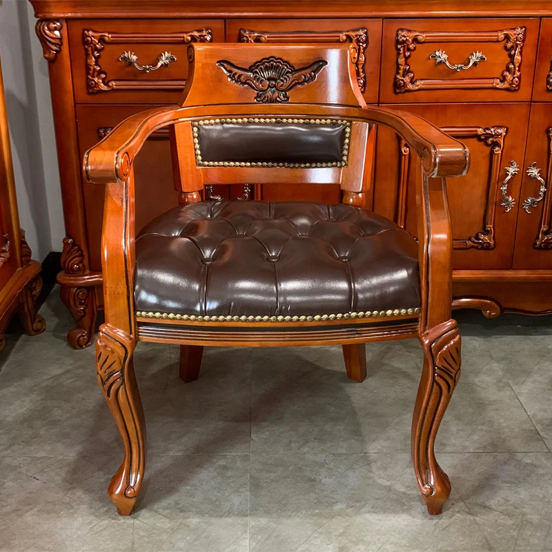 European Solid Wood Carved Armchair with Genuine Leather - Elegant Side Chair for Desks, Upholstered with Top Layer Cowhide, Perfect for Sophisticated Spaces
