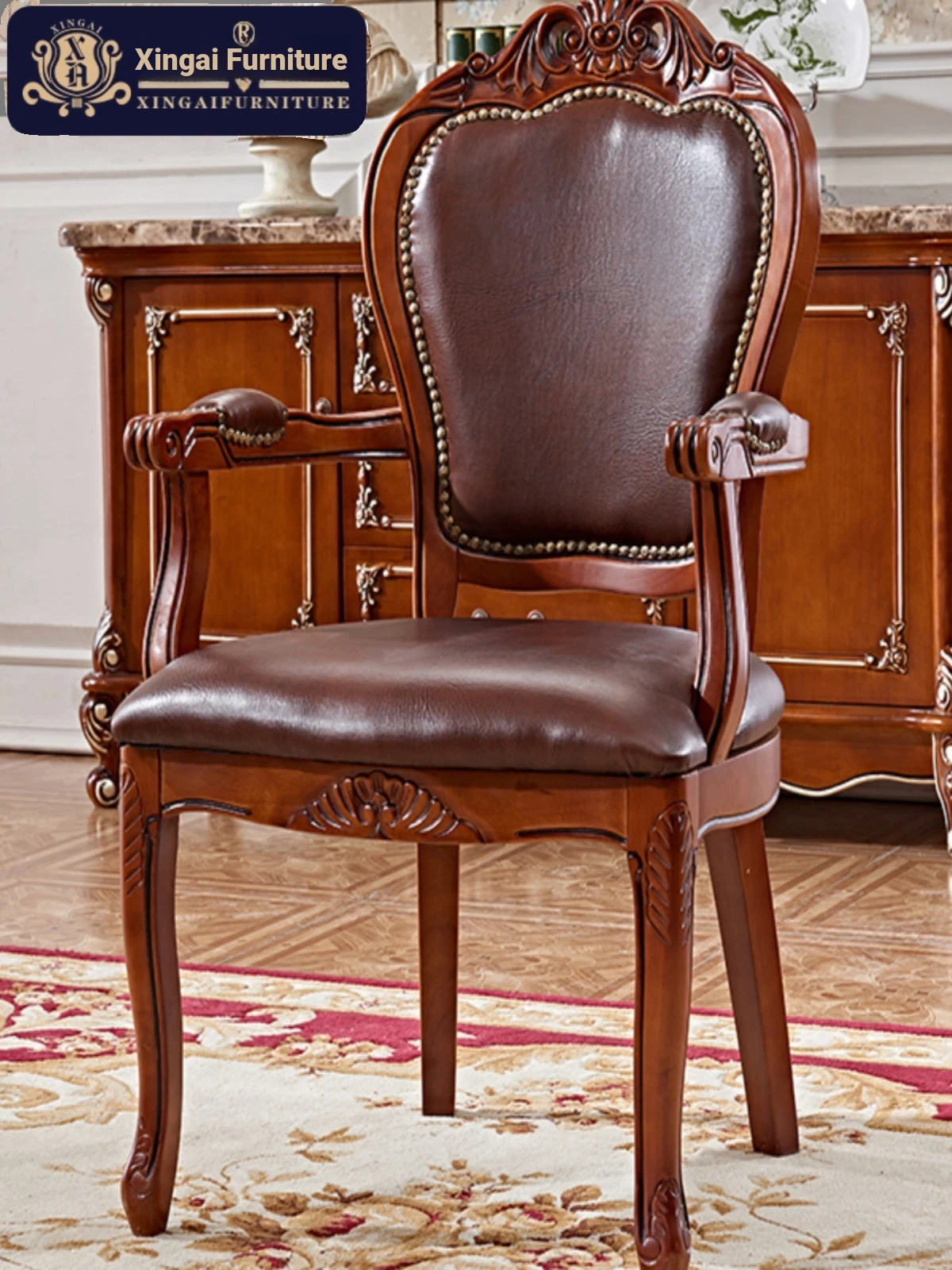Elegant American Solid Wood Armchair with Leather Trim - Luxurious Hotel Backrest Chair, Perfect for Business Meetings and Relaxation, Classic European Design