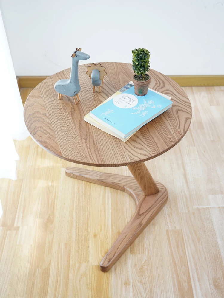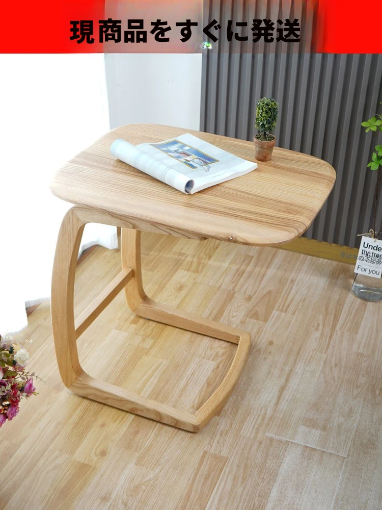 北欧風シンプルデザインのホワイトアッシュ木製C型サイドテーブル - 全面無垢材使用で移動も簡単!ベッドサイドやソファにぴったりのミニティーテーブル。おしゃれで実用的な空間づくりに最適です!