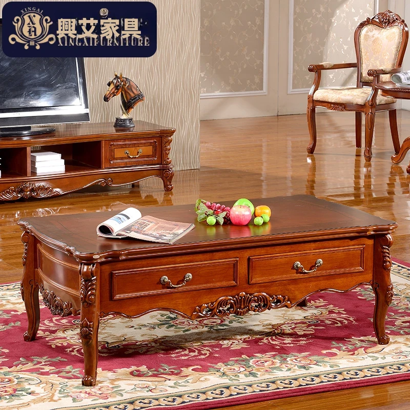 興艾オリジナル無垢材ロングコーヒーテーブル - アメリカンスタイル、1.6メートルの長さ、リビングルームにぴったりなソファとセット、便利な引き出し付き!デザイン性と機能性を兼ね備えた高品質な一品です。